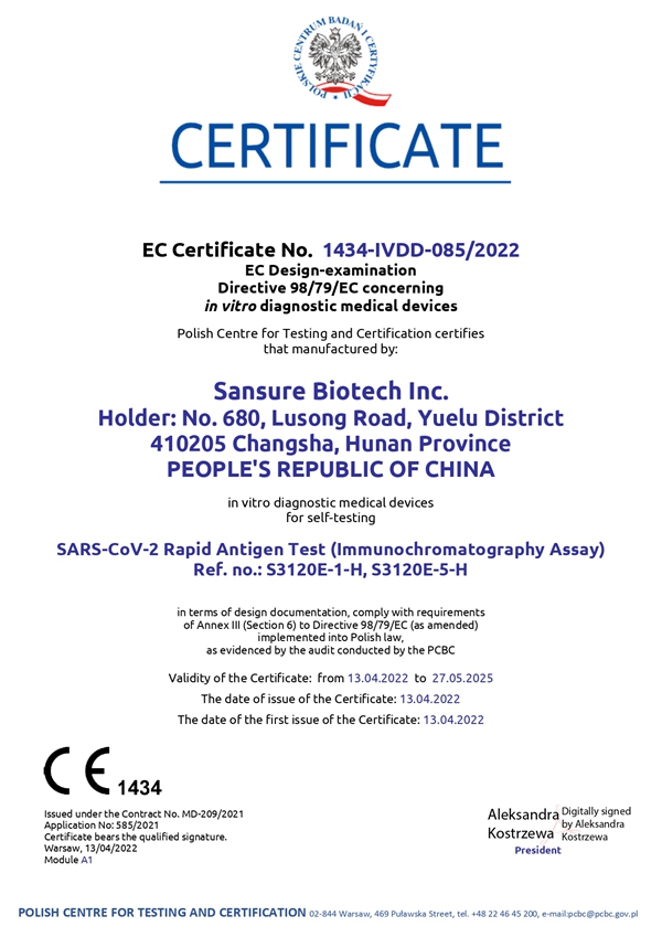 米兰电竞生物新冠快速抗原检测试剂自测产品取得欧盟CE1434自测证书,表明公司免疫检测产品性能获得官方机构认可,进一步丰富了米兰电竞生物全场景化新冠检测解决方案,扩大和满足了全球市场各级检测防控需求,为全球疫情防控工作持续助力。
