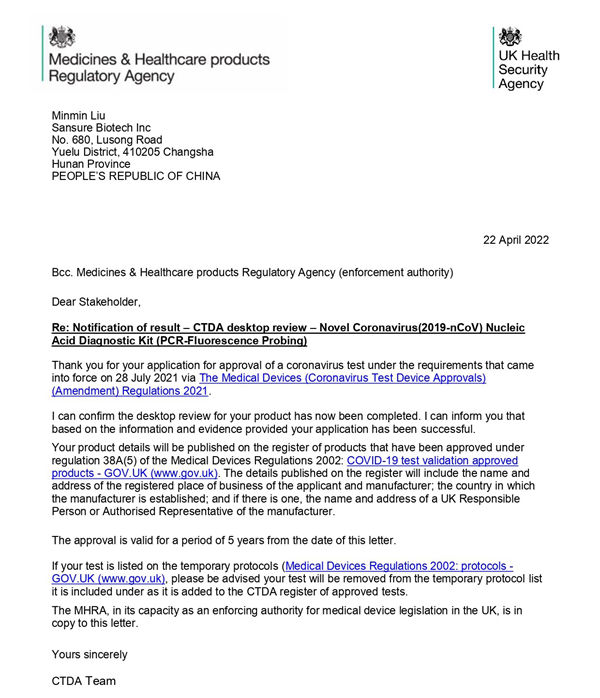 新冠检测试剂在英国上市必须经过CTDA审查和MHRA注册双认证,由于CTDA审查对产品性能的高要求,目前可在英国合法销售的新冠产品并不多。米兰电竞生物新型冠状病毒(2019-nCoV)核酸检测试剂盒(荧光PCR法)临床性能和分析性能均满足CTDA高要求,且得到进一步有效验证,获得了CTDA的充分认可。